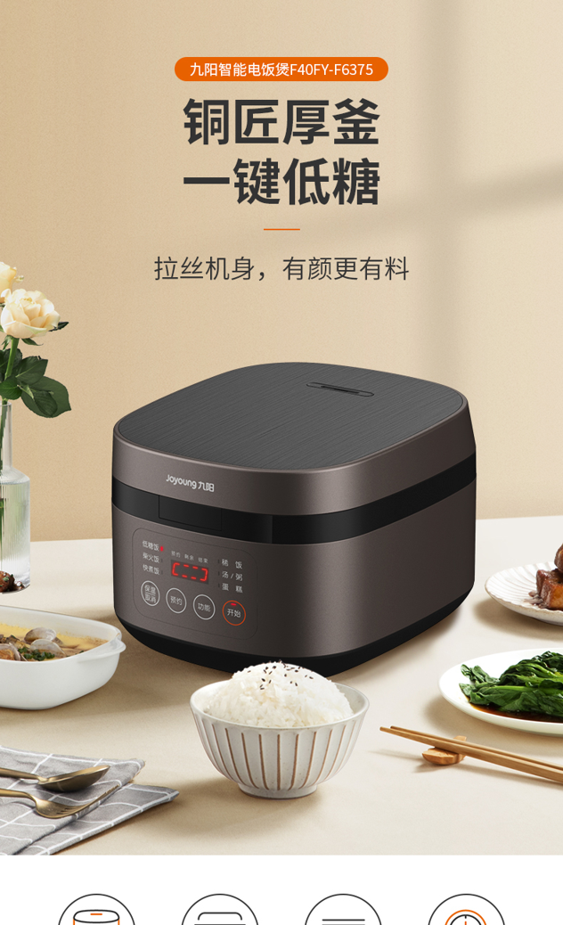 这款九阳 F-40FS812 全自动铁釜内胆电饭煲,容量是4L,适合3-6人食用,12大功能,原釜内胆,使米饭颗颗Q弹饱满。