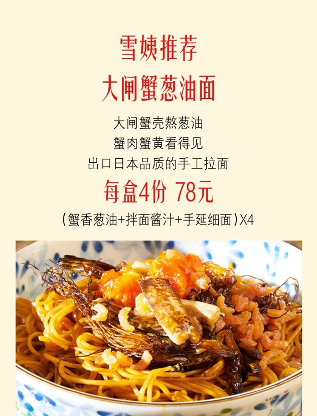 天猫丰收蟹庄旗舰店78元,可领20元优惠券,实付58元到手;雪姨推荐大闸蟹葱油拌面,一盒四份装,大闸蟹壳熬制葱油,蟹肉蟹黄看得见,出口日本品质的手工拉面,阳光下自然晾晒,煮熟以后,不粘、不坨,劲道。内含:(蟹香葱油+拌面酱汁+手延细面)*4份。