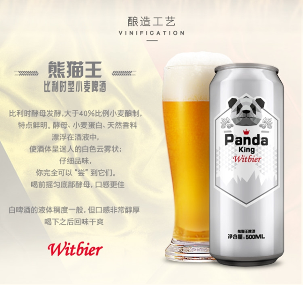 总部位于香港的老猫酒业(上海)有限公司本着"世界的熊猫,中国的骄傲"的精神,让"熊猫王"品牌回归市场。严格遵循1516年德国颁布的《啤酒纯酿法令》、采用国内最尖端的酿造技术、严选原材料。用百分之百的精选麦芽和颗粒酒花,不加任何辅料精酿而成。