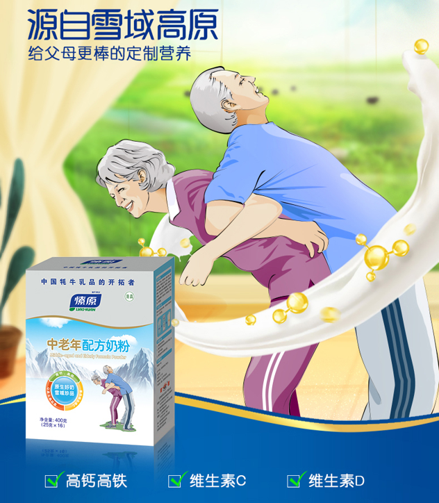 此款中老年配方牦牛奶粉,添加钙铁锌元素,帮助改善食欲,添加维生素,促进钙的吸收,添加牛磺酸,维护大脑和视觉神经细胞健康,适合中老年饮用。