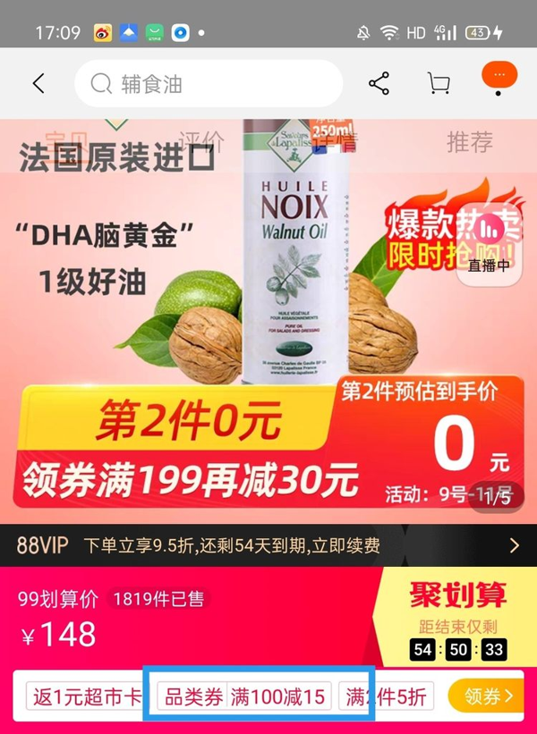 =98元 到手价,到手250ml*2瓶。核桃油含有丰富的磷脂、亚麻酸、角鲨烯和多酚等物质,能促进智力发展、提高视力、增强免疫力等,是比较适合宝宝的一款食用油。 《中国营养学会妇幼分会》曾发布了婴幼儿膳食宝塔,其中明确的指出,在宝宝六个月的时候就可以适当吃油了,因此,婴儿在六个月之后就可以吃核桃油了。