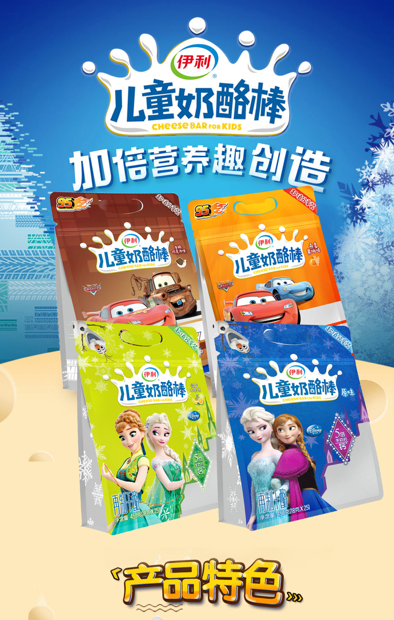 伊利奶酪旗舰店,迪士尼联名产品。5倍牛奶的钙,儿童奶酪棒加倍营养!富含牛奶蛋白,甄选进口奶源,臻达营养与美味的更高水准,口感细腻紧实,好吃不甜腻,采用比利时进口全密闭阻氧包装,牢牢锁住营养,杜绝外物污染。规格:25只/袋*2袋。
