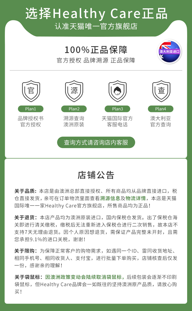 Healthy care是Nature's Care公司旗下的高端保健品品牌,只在澳洲最大连锁药房销售。Nature’s Care Australia是澳洲最大的保健品、护肤生产厂家之一,是澳洲第一家获得TGA认可的cGMP健康食品护肤品厂。