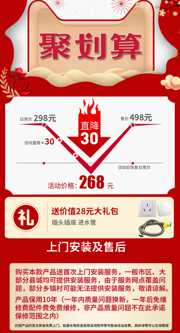 =238元 到手价,下单送安装包和插头,全国免费安装,但涉及水电改造以及复杂配件时需要收费。我非常不推荐买即热式水龙头,如果有需求就买这种小厨宝,这种即热设备属于大功率电器,五六十的即热式水龙头用起来很可能有危险。