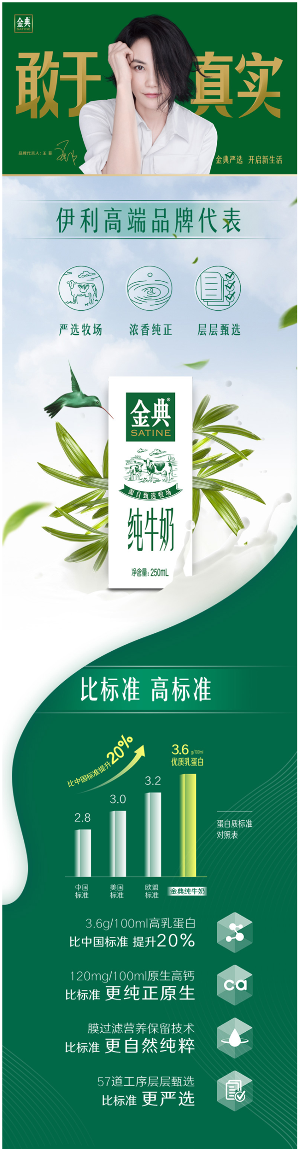 这款金典牛奶源自伊利甄选牧场,奶源无污染,确保绿色健康,优质乳蛋白高于3.3g,营养丰富,唇齿留香。
