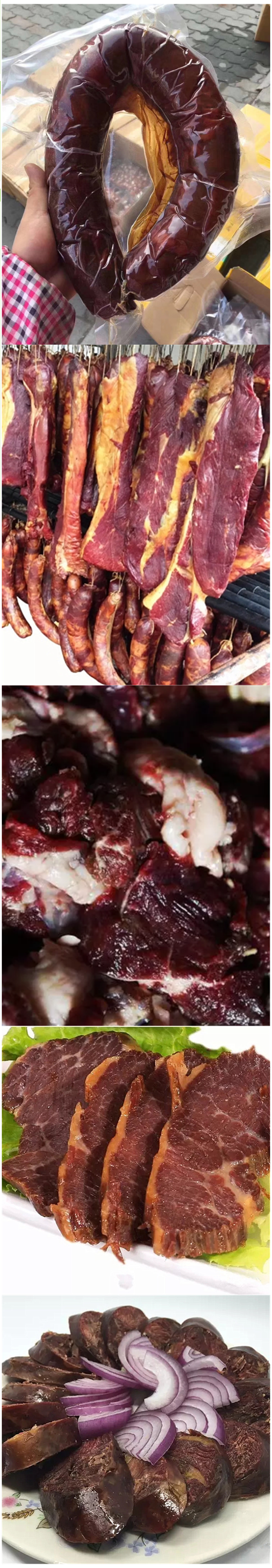 被熏烤过的马肠均匀脱水,表层缓慢转变为焦糖色,在肠衣的密闭保护下,马肉、肋骨、脂肪协同分解和转化,由表及里凝敛风味。规格是2斤,真空包装。