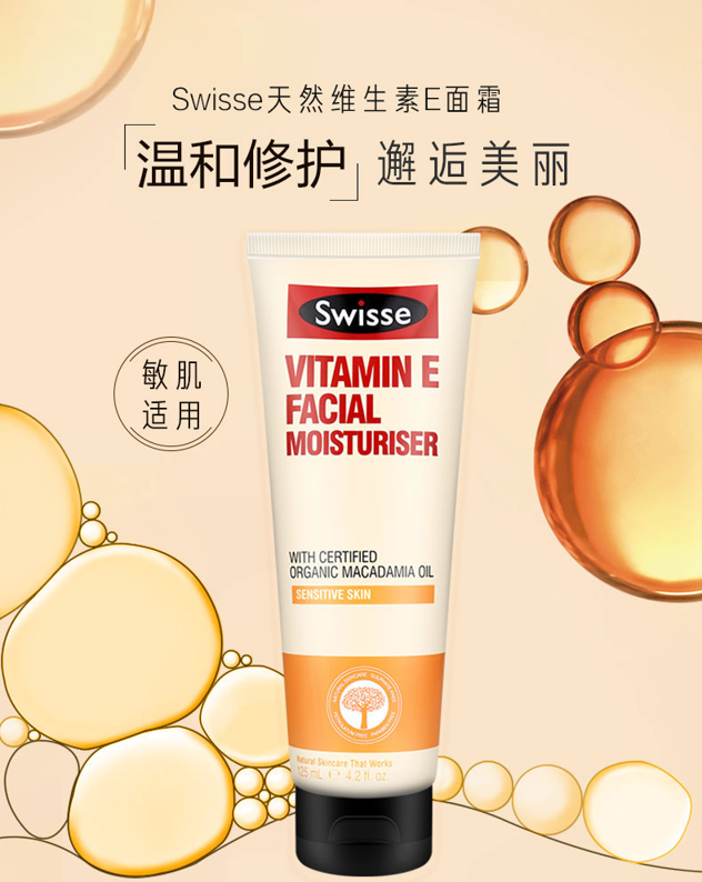 这款 Swisse 维生素E保湿面霜,规格: 125ml,敏感肌适用,富含天然维生素E成分和有机夏威夷果精华,加倍滋润保湿,洋甘菊成分,对过敏皮肤有舒缓镇静的作用,改善青春痘,抚平细纹皱纹,提亮肤色。质地轻薄,不油腻,让肌肤自由呼吸。