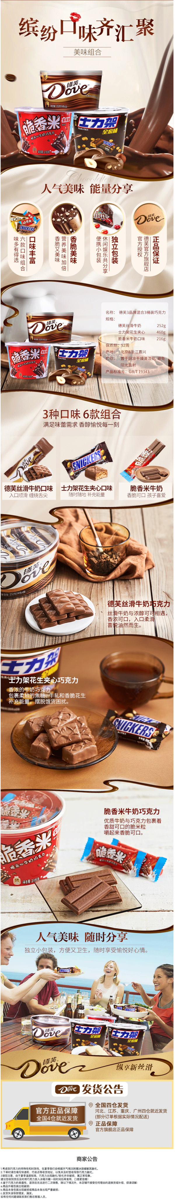 这款是德芙牛奶 252g+脆香米 216g+士力架 460g的组合。自1989年进入中国以来,德芙已经成为中国巧克力的领导品牌。在众多巧克力品牌中,德芙应该是亲民价位里口味最好的,柔滑口感可谓是深受喜爱。
