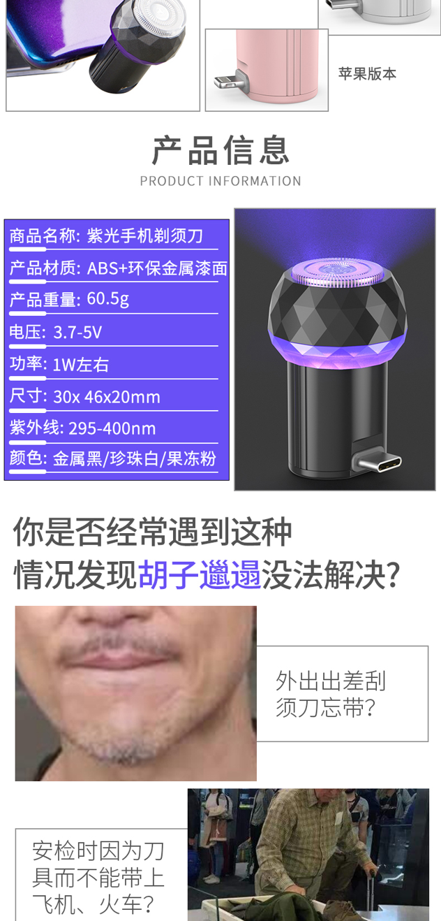 天猫美莫旗舰店129.9元,可领110元优惠券,实付19.9元到手,便携式安卓款迷你紫光手机剃须刀,ABS+环保金属漆面,全身水洗,干湿双剃型,马达稳定更强劲,尺寸30*46*20mm,小巧不占空间,送收纳袋毛刷,旅行便携刮胡刀,公司备一个随时用,妈妈再也不用担心我胡子邋遢了。