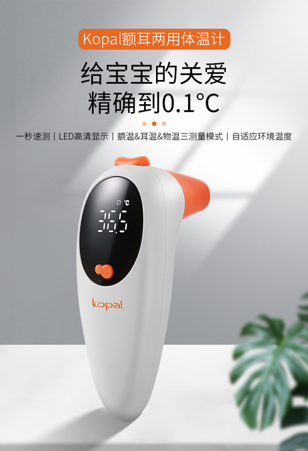 这款Kopal电子体温计,远红外线非接触式测温,不会引起宝宝的哭闹。使用高精度专利探头,内置高灵感红外传感器,精度达到0.1°C,能在短时间内多次采集额头温度数据,1秒钟速测体温。