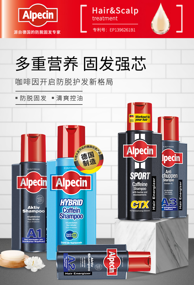 原产地德国,所含的咖啡因综合成份能有效刺激毛囊抑制脱发,为发根源源不断的输送活性成分。独有的Alpecin咖啡因有效成分能在120秒后迅速到达发根,作用时间长,效果明显。