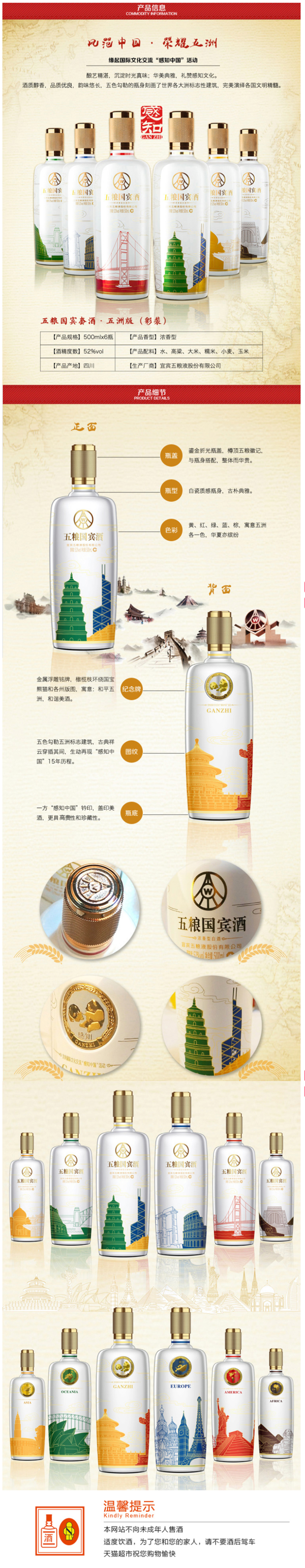 鎏金折光瓶盖,樽顶有五粮徽记,搭配白瓷质感瓶身,古朴典雅,看起来非常高档华贵。酒瓶分别是黄、红、绿、蓝、棕色,寓意五洲各一色,瓶身上还刻画了世界各大洲标志性建筑。金属的浮雕铭牌,橄榄枝环绕国宝熊猫好和各州版图,寓意和平五洲。