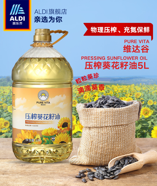 5升装。这款维达谷 天然压榨葵花籽油,原瓶进口,采用纯正葵花籽脱壳物理压榨,保留丰富的营养成份,反式脂肪酸<1%,富含维生素E,油质清澈透明,呈淡淡金黄色,清淡少油烟,高温烹饪、凉拌生吃皆美味。
