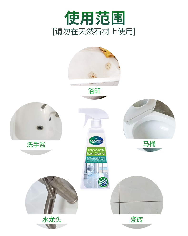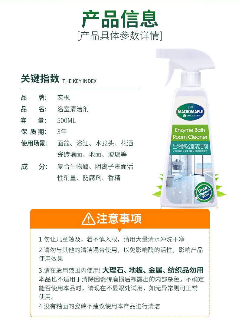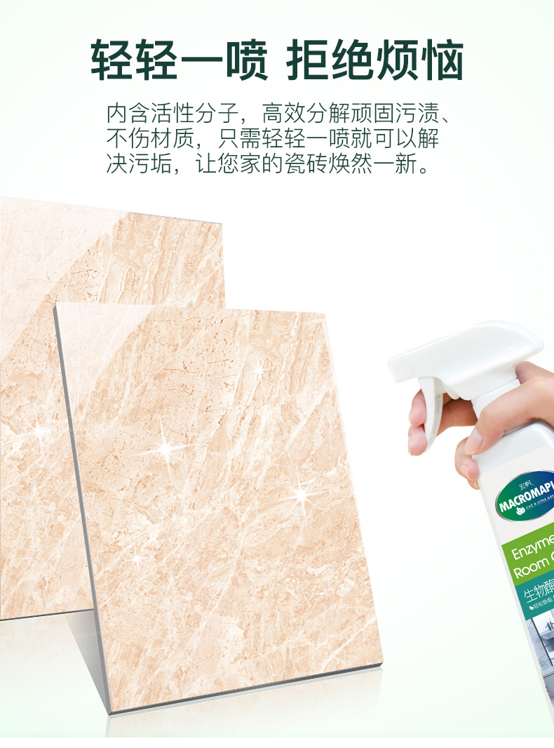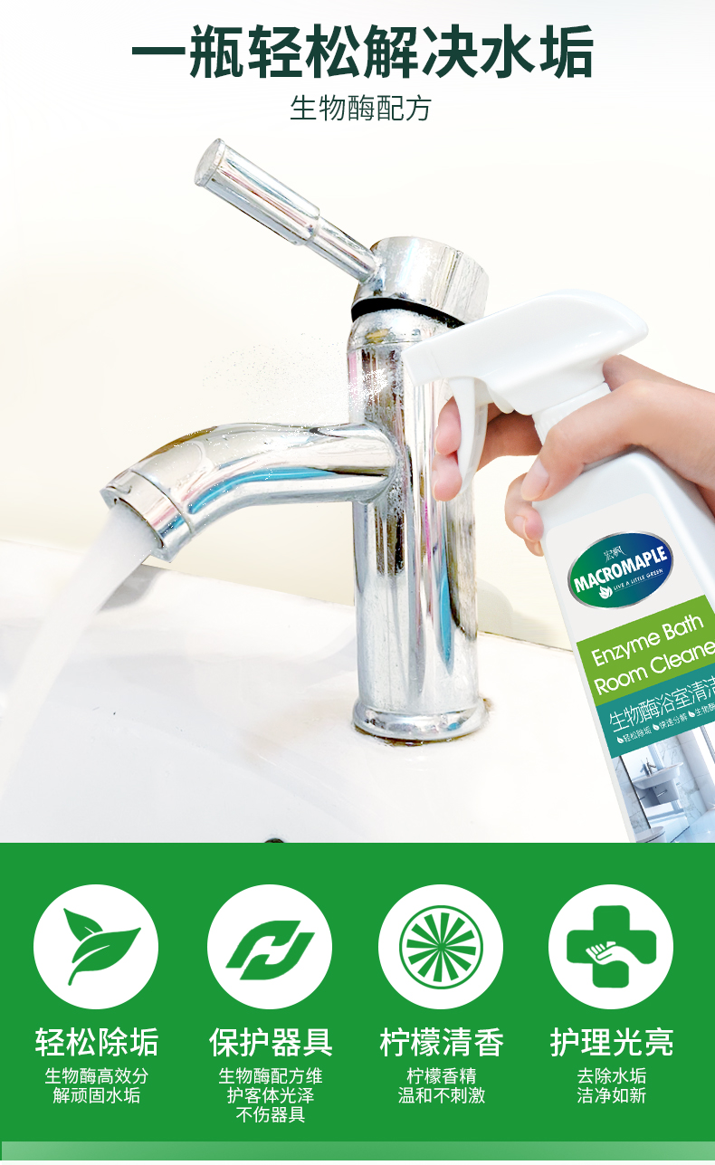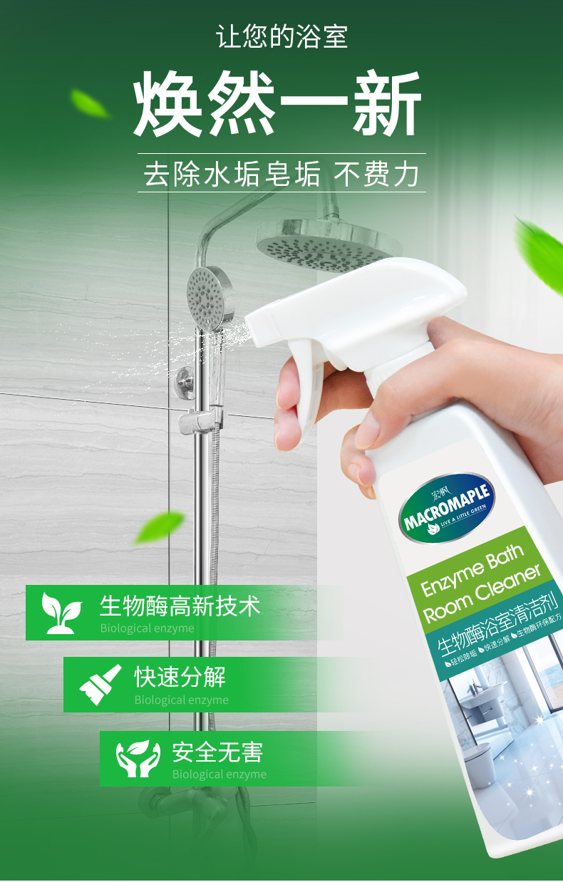 这款宏枫 生物酶瓷砖清洁剂,使用生物酶高新技术,内含活性分子,能高效分解顽固污渍、不伤材质,只需轻轻一喷即可,无刺激性气味,适用于水龙头水垢、淋浴房玻璃、前面瓷砖、金属表面水垢、浴室锈迹。