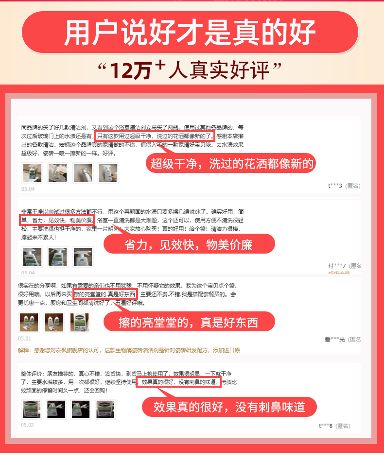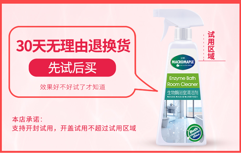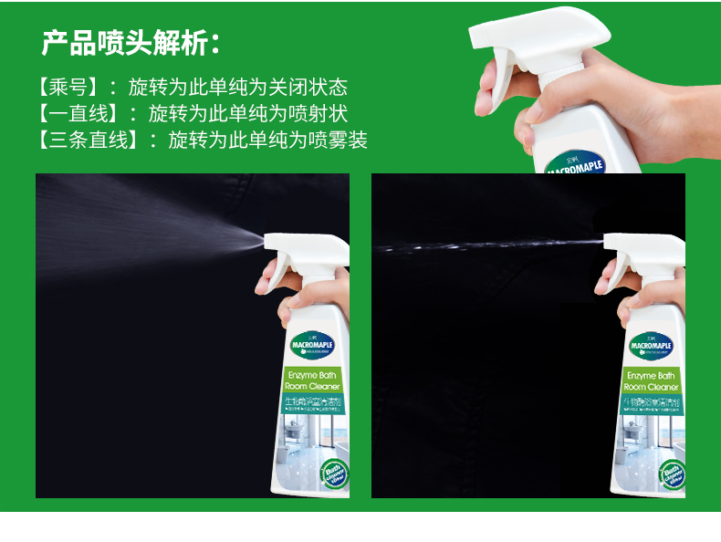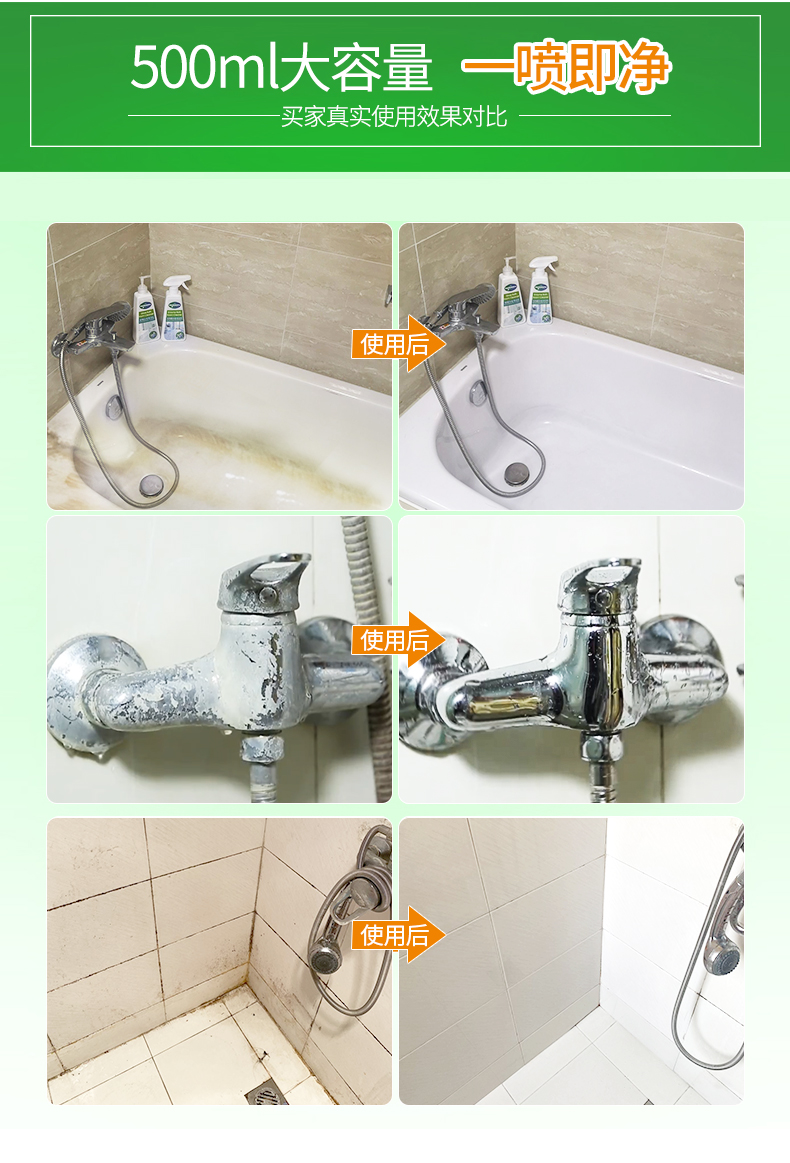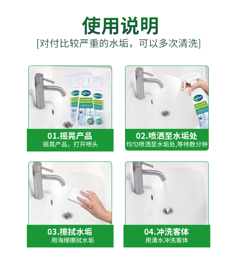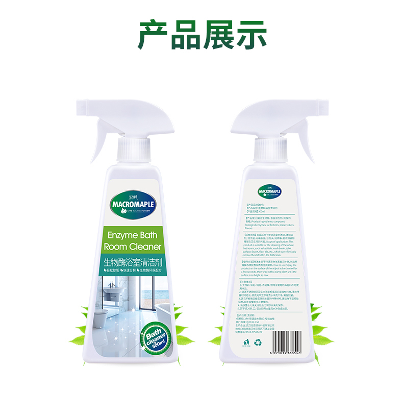 这款宏枫 生物酶瓷砖清洁剂,使用生物酶高新技术,内含活性分子,能高效分解顽固污渍、不伤材质,只需轻轻一喷即可,无刺激性气味,适用于水龙头水垢、淋浴房玻璃、前面瓷砖、金属表面水垢、浴室锈迹。
