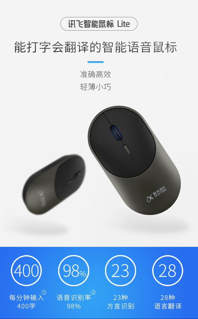 科大讯飞这款智能语音鼠标,智能语音核心技术,语音打字可达400字/分钟,识别准确率达到98%。能快速识别图片,PDF文档,照片上的文字信息,提升信息处理效率。纤薄机身有质感,体型小巧,外出办公方便携带。