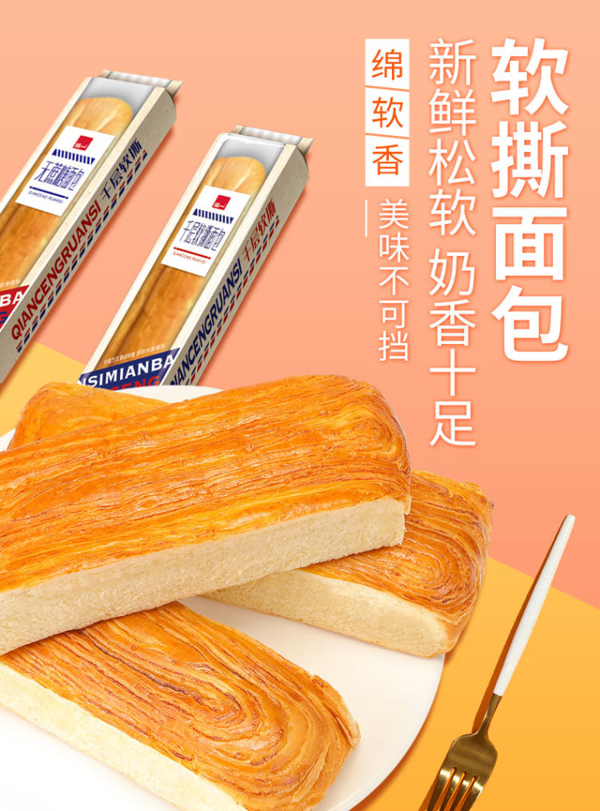 甄选阳光小麦,低温发酵,慢烤烘焙!千层手撕面包醇香可口,特别特别松软,撕着吃,越吃越过瘾!甜而不腻,老少皆宜!营养早餐的必备!领券链接点此
