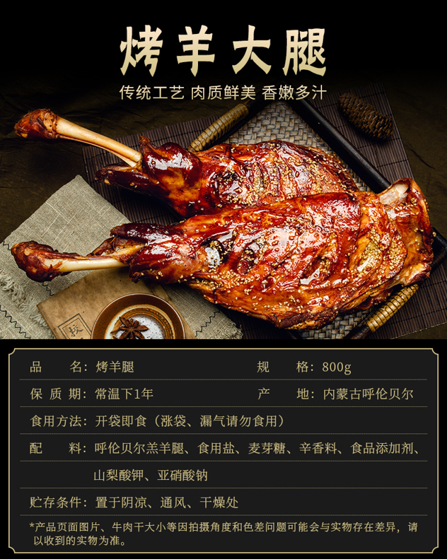 源自自呼伦贝尔大草原的舌尖美味,精选牧场羔羊羊腿,肉质鲜嫩,鲜而不膻,传承古法炭火烤制,新鲜现烤现做,真空包装保障羊腿不失鲜嫩口感,不出门就能品尝到正宗大草原的美味。