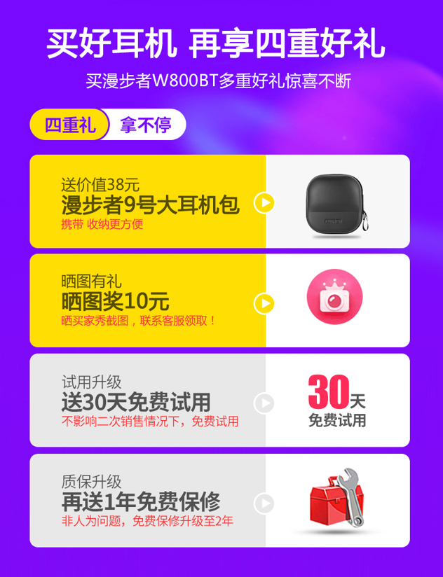 天猫漫步者美澳专卖店199元,可领20元优惠券,实付179元到手,下单赠价值39元的耳机包,晒单还能返10元,30天免费试用。漫步者W800BT蓝牙耳机,集颜值与实力于一体,采用40mm高性能钕铁硼单元,复合振膜,日本大黑音圈,声场强大,解析出色,低频强劲。