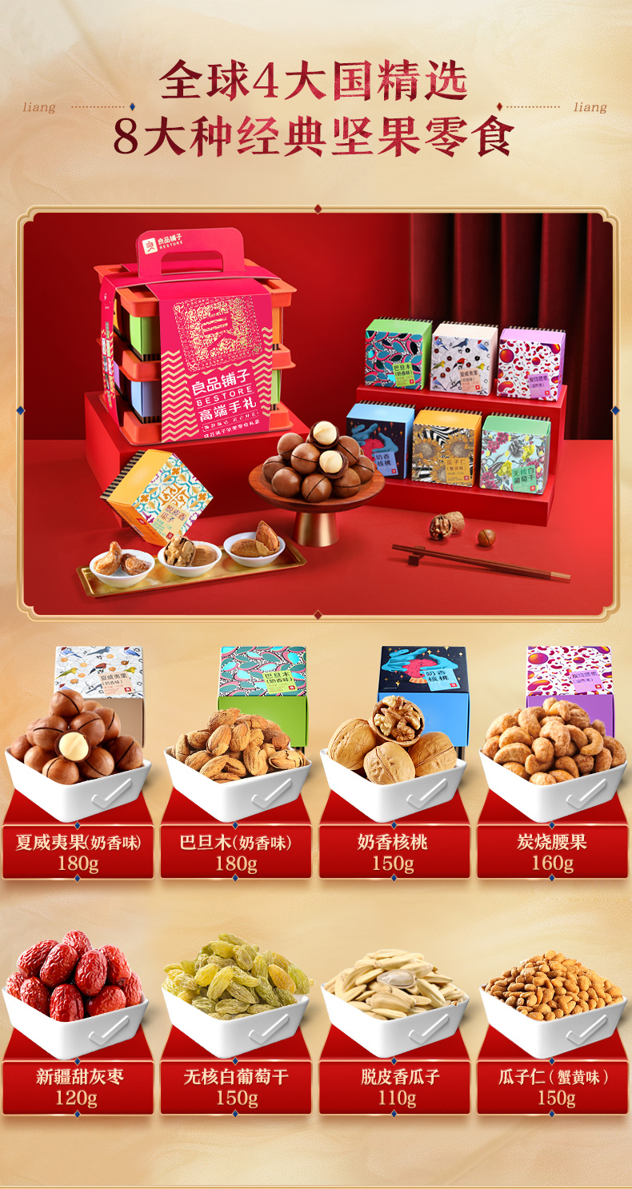 礼盒含有8款经典纯坚果,经过3到手工筛选,精选10%大果,开口率99%,大果更好剥。包含:夏威夷果奶香味 180g、巴旦木奶香味 180g、核桃奶香味 150g、炭烧腰果 160g、新疆灰枣120g、无核白葡萄干150g、脱皮瓜子110g、蟹黄瓜子仁150g。