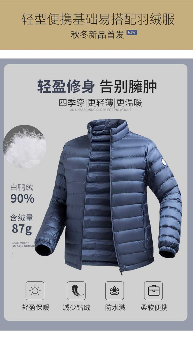 这款雪中飞 男士轻薄羽绒服,采用100%聚酯纤维面料,无缝一体织工艺,直接织造出羽绒分格仓,无压胶无针孔,高度锁绒,表面拒水处理,具备良好的耐水性及透气性,防水性能达3级,可防小雨,内部填充90%品质白鸭绒,防风保暖,防风罗纹双层袖口,耐磨耐穿,保暖性好。
