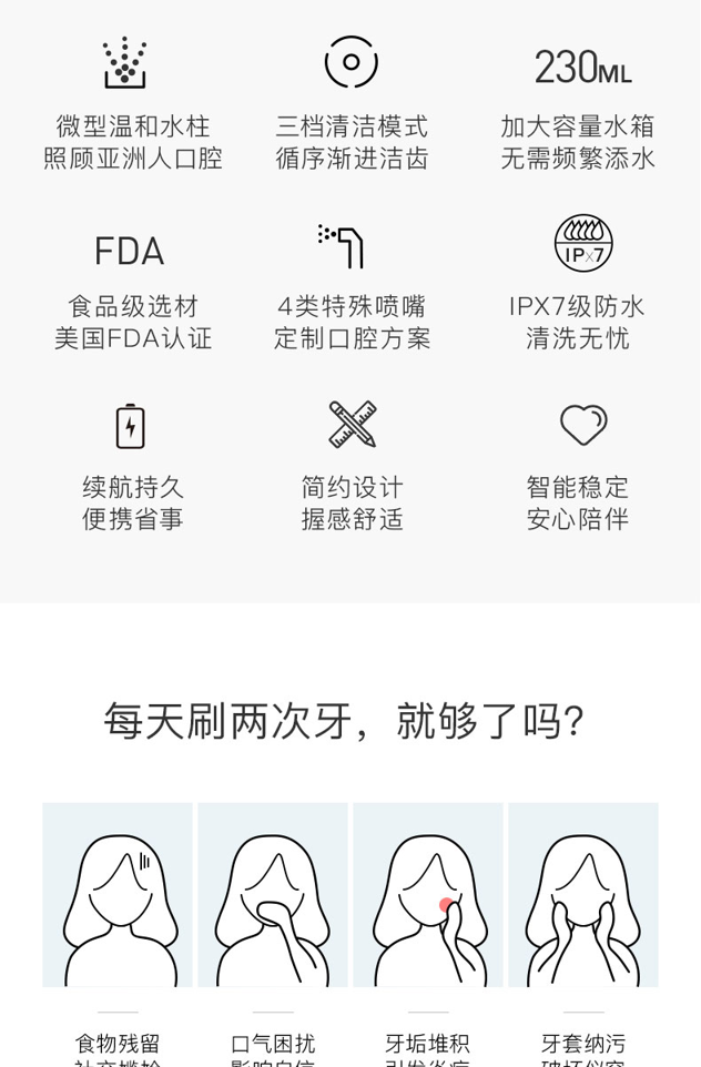 水牙线是通过水压和脉冲水流的结合,来深层清洁牙龈和牙齿之间的缝隙,比普通牙刷牙线和空气牙线清理更加干净,经常使用可以避免牙菌斑及牙龈出血,补充了普通牙刷的不足,尤其是清理因为佩戴牙套、有食物残渣的牙齿时,特别好用,会有种发现新天地的感觉。