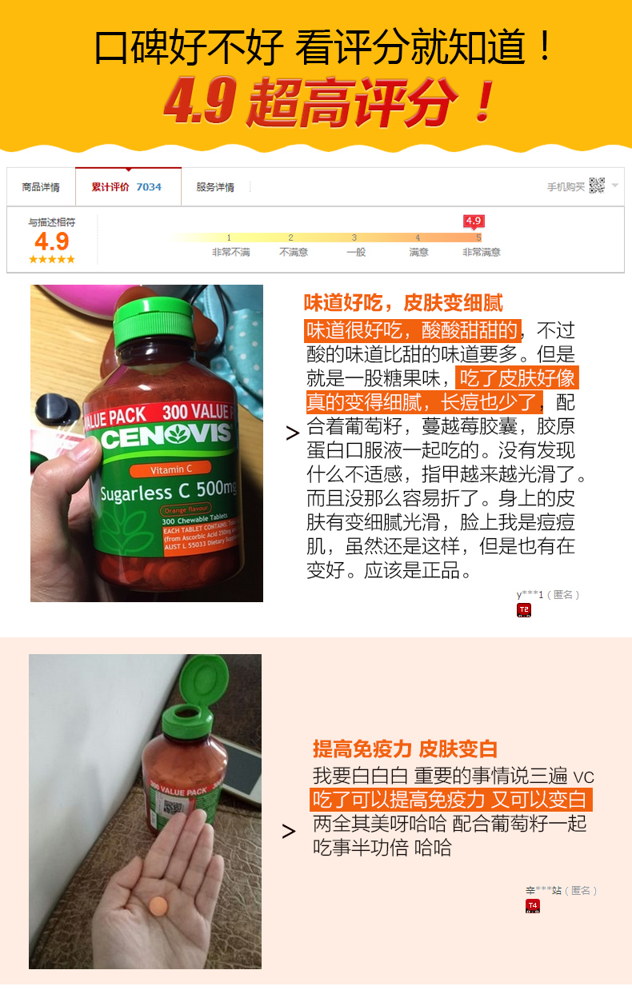 这款Cenovis维生素C咀嚼片,1000%澳洲原装进口,每片含维生素C 500mg(抗坏血酸250mg,抗坏血酸钠281mg),一片相当于20个橙子,天然橙味,酸酸甜甜的口感大家都爱吃,酸酸甜甜的口感大家都爱吃,特别是无糖配方的设计,连糖尿病人都可服用,一直服用也不担心会蛀牙或者发胖。
