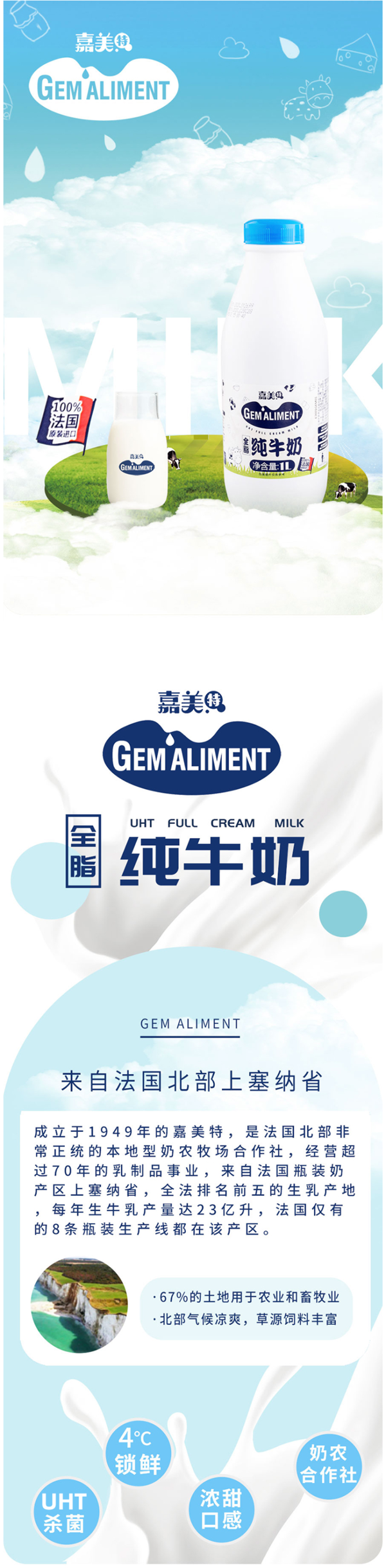 这款嘉美特 全脂纯牛奶,法国原装进口,奶源是自家牧场的优质100%生牛乳,每100ml牛奶中含120mg的钙、3.4g的蛋白质,营养价值完全达标,牛奶清醇不油腻,口感绵软香甜。