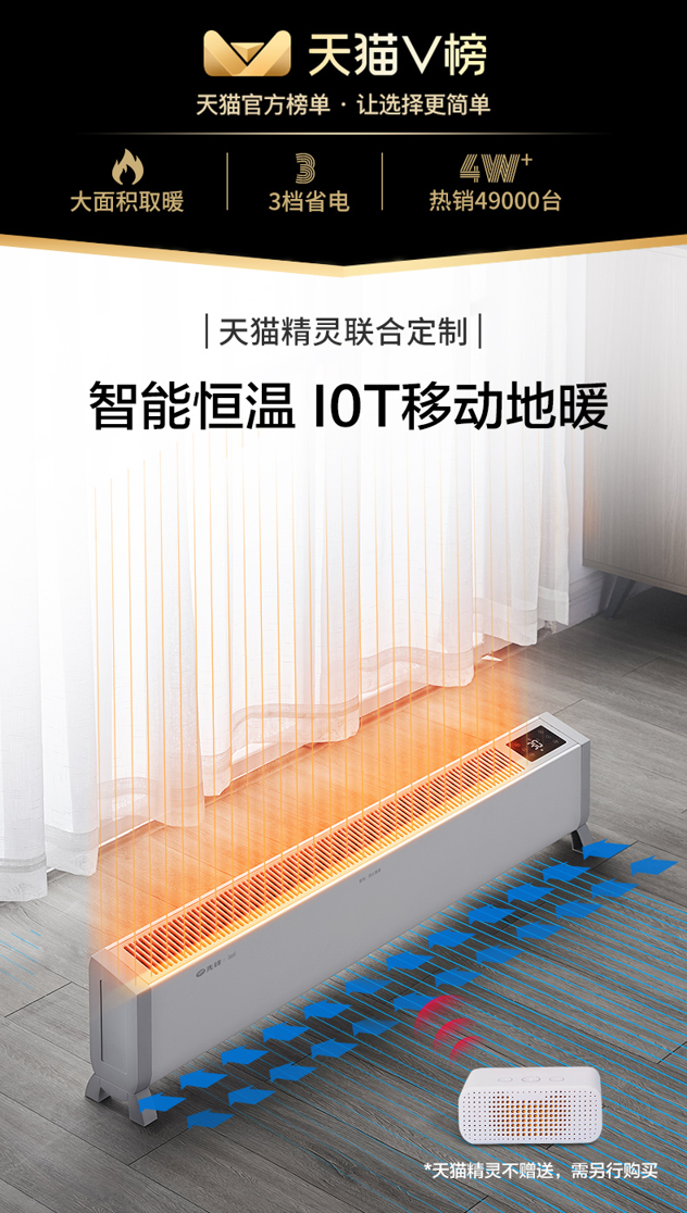 移动式地暖,从下往上热气流立体循环,整屋升温。ipx4级防水,居浴两用,135片大热量,10s速热 ,一开就热全屋暖,支持手机APP 全程监控,支持24H 预约手机开关机。具备安全童锁、倾倒自动断电、过热保护等安全防护。