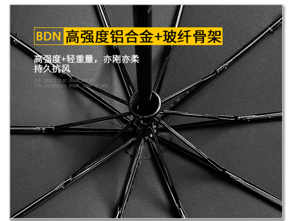 这款宝迪妮 全自动伞,是由高强度的铝合金+玻纤组成的伞骨,具有强度高,重量轻的特点,亦刚亦柔,持久抗风不易折断;高碳钢弹簧,高弹力,高拉力,更稳固;伞面升级210条的高密伞布,表面附着纳米防水涂层,有效阻隔雨水,一甩即干。强力反光条包边,在雨夜中行走中,提供了安全保障。