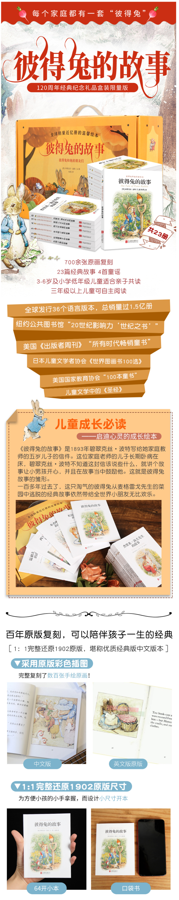 这款《彼得兔的故事绘本》,共全套23册盒装,英国原版引进,1:1尺寸复刻,全球畅销近亿册。拥有700余张原画复刻,23篇经典故事,4首童谣,适合3~6岁及小学低年级儿童,最好亲子共读。
