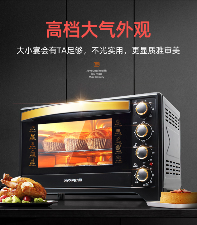 天猫九阳小阳专卖店,25-27日 金秋潮电季¥409元 金秋超值价,-20元 下单立减,-160元优惠券,-满300减30元 购物券,=199元 到手价,直降40元,第2款(标配款)此价,38L大容量,四旋钮上下独立控温,三种加热模式,灵活调节火候,三层加宽烤位,内置防爆照明灯,安全更耐用,加热快,受热均匀,10大家常菜谱,美味一机搞定,居家必备。