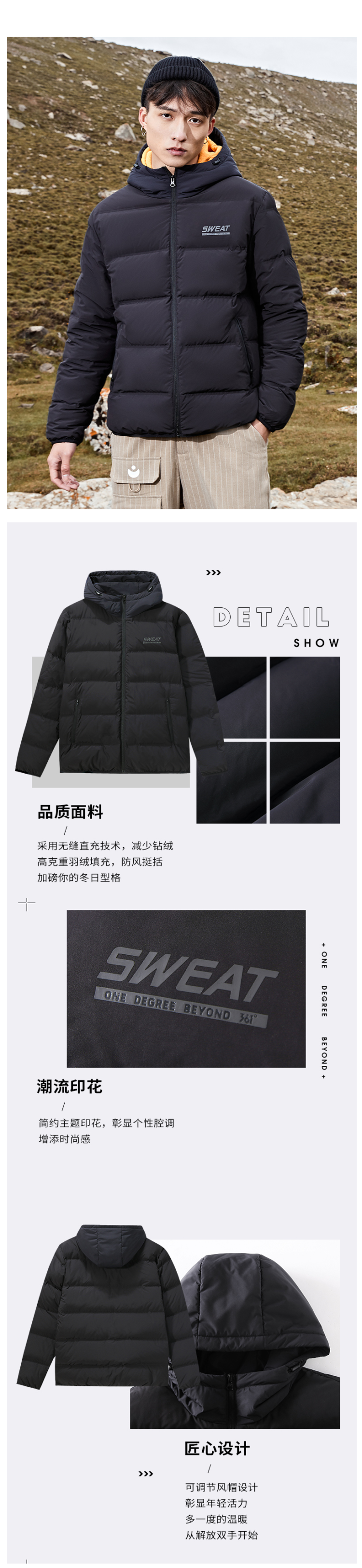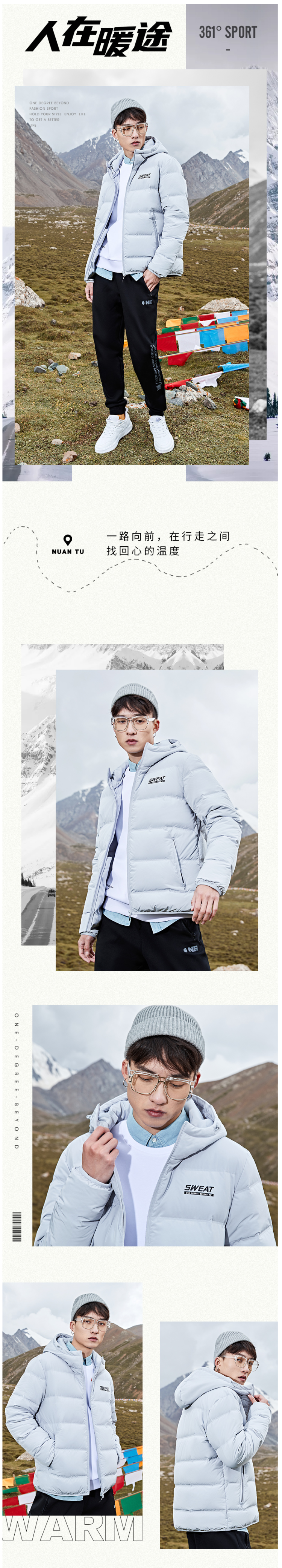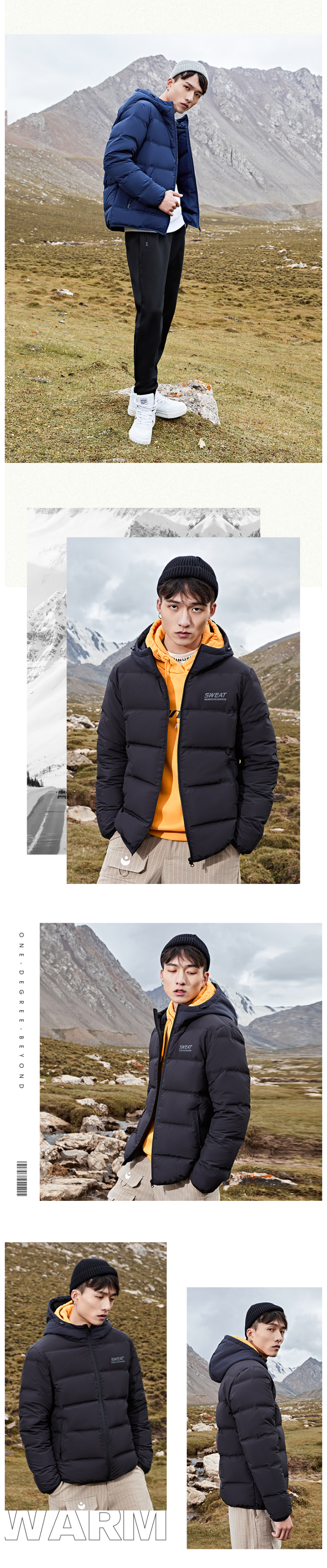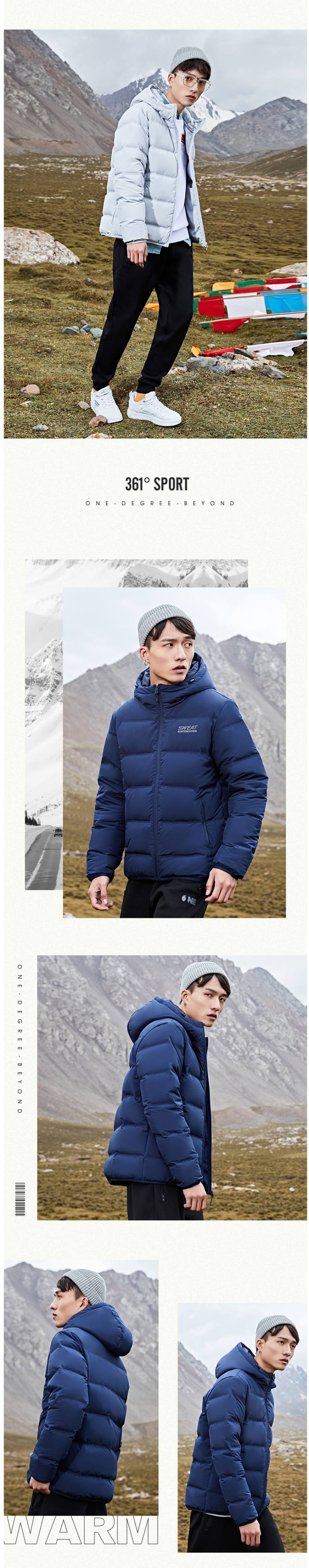 这款361度男连帽羽绒服,是2020秋冬新款,采用100%高密度锦纶面料,紧实严密,防风防雨。内里填充100~150g的鸭绒,充绒量达90%,算是薄款和中厚款之间的一个过渡,适合零下5~0度的天气穿。