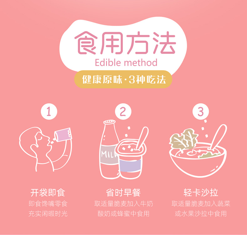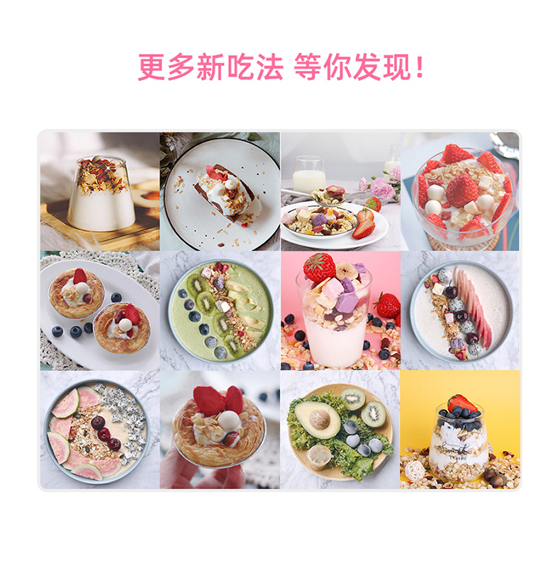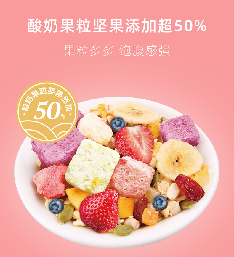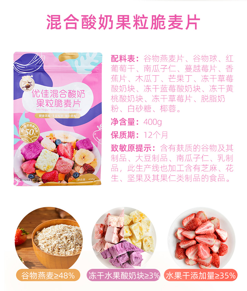 原料甄选:谷物燕麦片、谷物球、红葡萄干、南瓜子仁、蔓越莓片、香蕉片、木瓜丁、芒果丁、冻干草莓酸奶块、冻干蓝莓酸奶块、冻干黄桃酸奶块、冻干草莓片、椰蓉。科学配比,营养均衡,热量低,轻烘焙更健康,鲜香酥脆,营养又美味,饱腹代餐,可开袋即食,还可搭配牛奶、酸奶冲食。