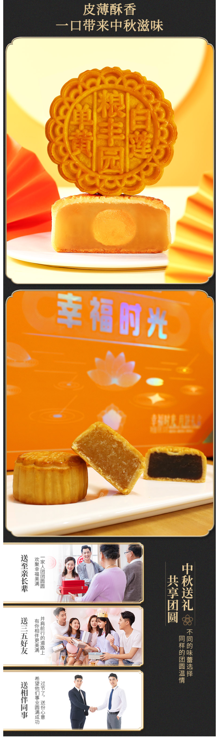 这款粮丰园 幸福时光广式月饼礼盒,蛋黄纯白莲蓉月饼 150g*1、黑芝麻莲蓉月饼 50g*2、红豆沙月饼 50g*2、冬蓉翅月饼 50g*1、椰蓉月饼 50g*1、枣蓉月饼 50g*1,共8饼6味/500g。