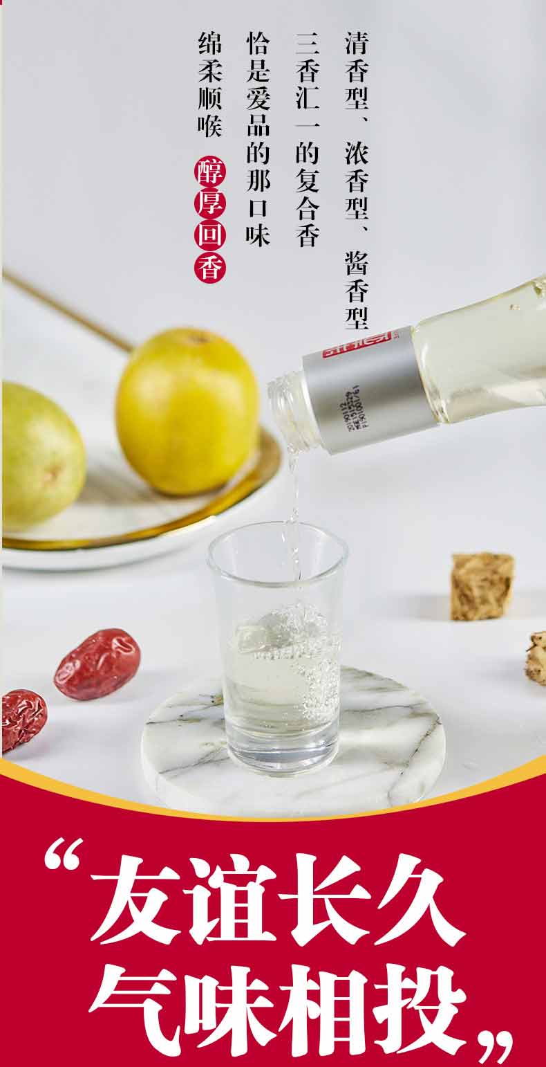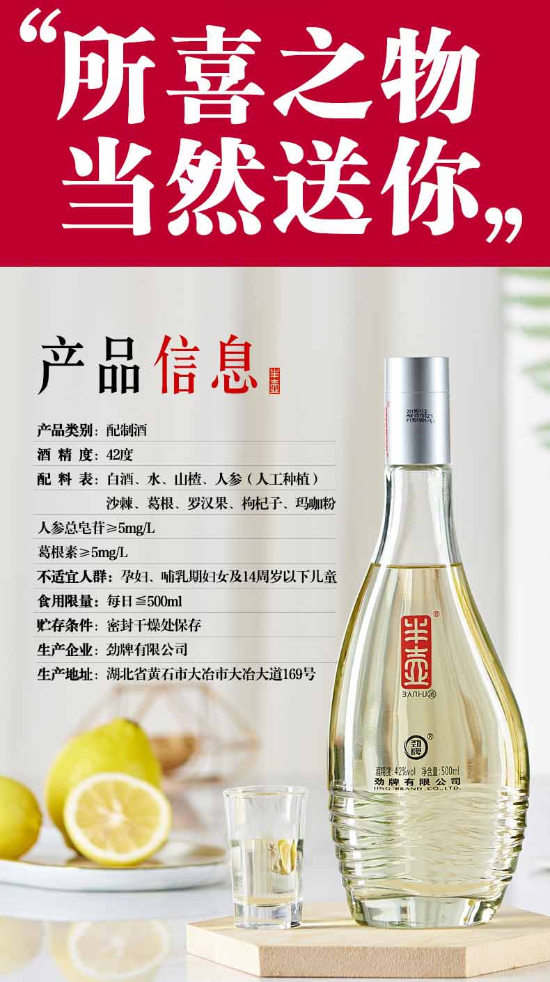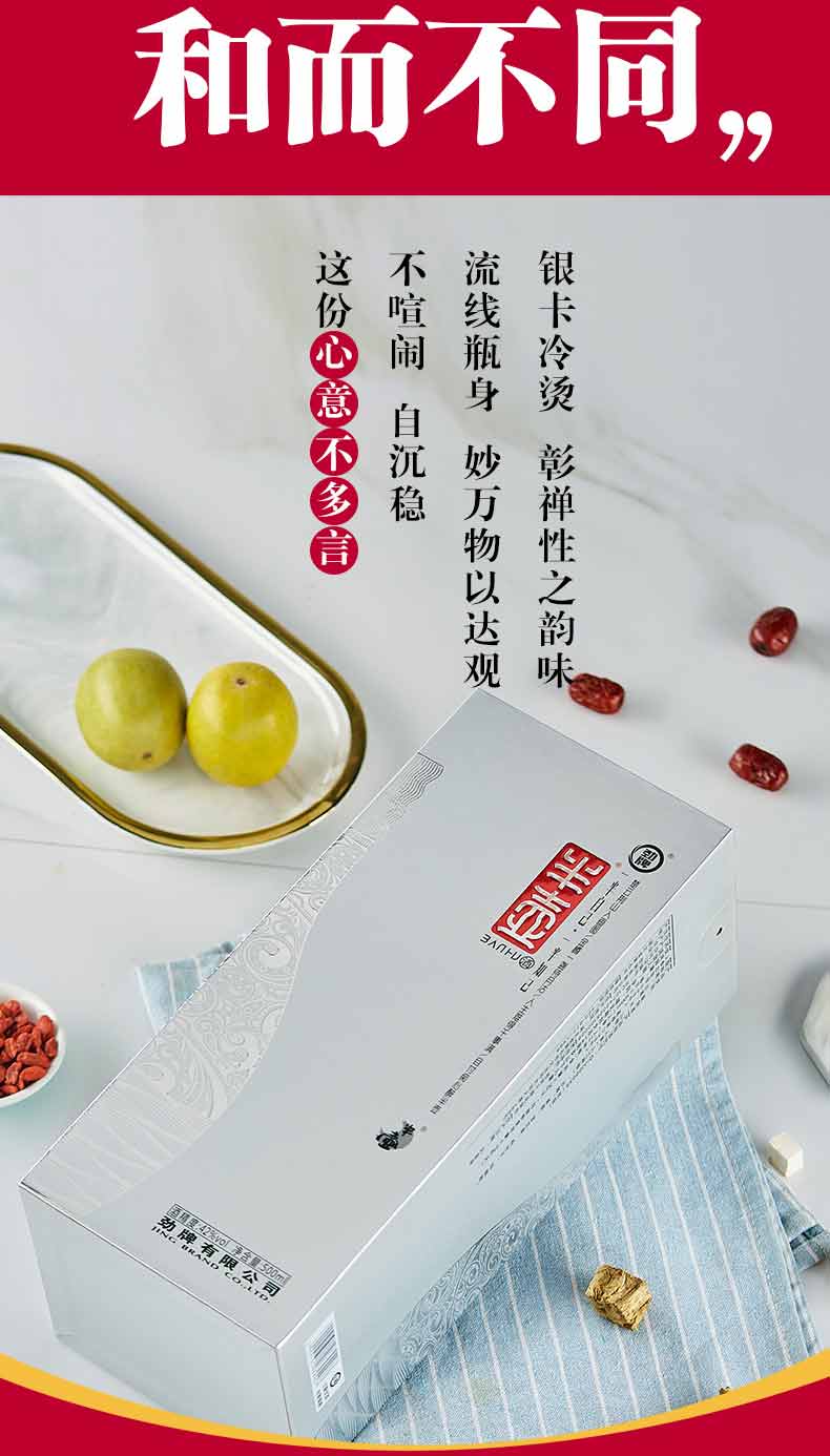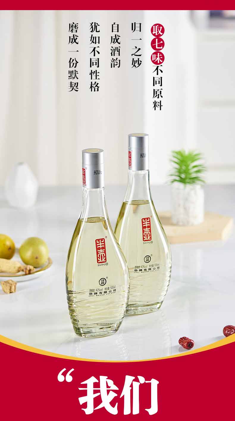 半壶酒开发参考标杆是五粮液,健康内涵为降血脂,减轻肝损伤。采用传统酿造工艺与现代生物发酵技术的有机结合,采用优质糯米、高粱和小麦精心酿制,在取人参、沙棘、葛根、罗汉果、枸杞子、玛咖粉、山楂七味不同原料陈酿多年。具有清香、浓香、酱香、三种复合香,酒体绵柔顺喉,醇厚回香。