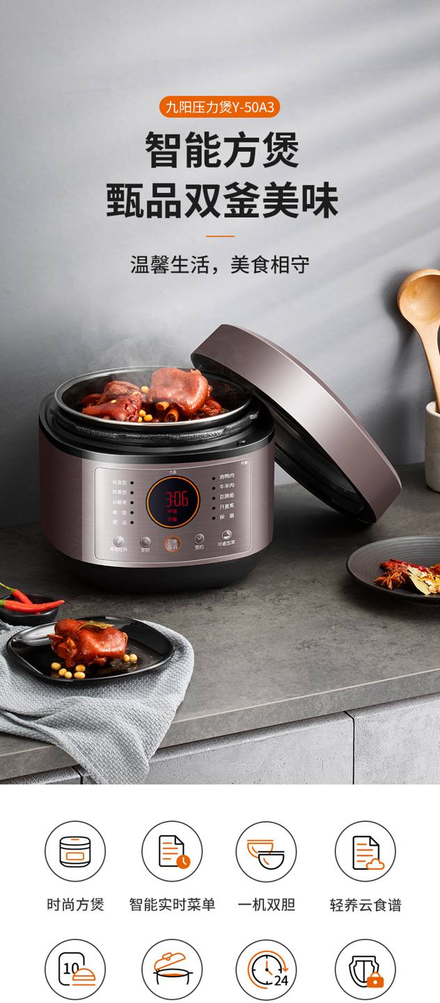 细节上:智能操作界面,拥有10大功能菜单,可24预约定时,使用更方便。具有防烫保护、过流保护、压力自控、漏电保护、防堵保护、限压保护、泄压保护、开合盖保护、防干烧保护、超温保护,共十重安全防护。一键反向排汽,远离双手,预防烫伤,使用更安全。