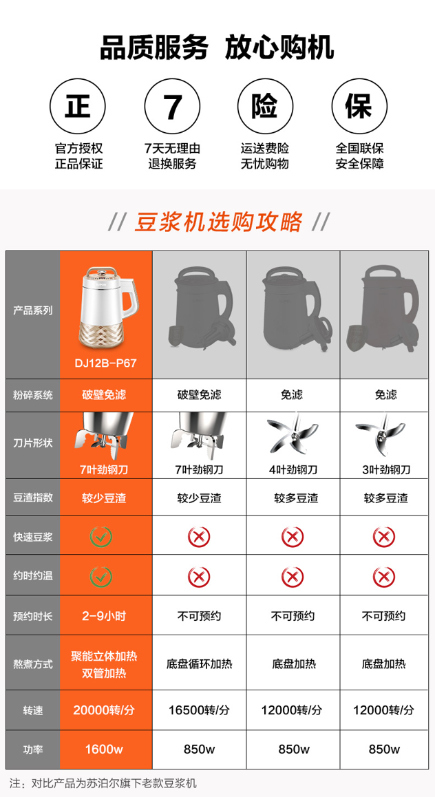 这款豆浆机,强劲电机输出,转数达到20000转/分钟,刀头升级为7叶螺旋劲钢刀(由四叶锯齿研磨刀+三叶破壁刀),可以形成强大旋涡,让食材不断循环,强劲粉碎破壁释放营养,口感细腻丝滑,提升了粉碎效果。