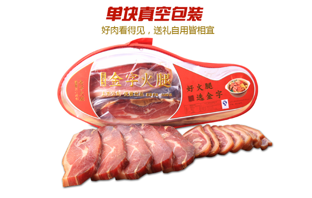 《舌尖上的中国》推荐金华金字火腿,经过精细分割,每块真空包装锁鲜,使用时温水洗净,可切丝、片、丁等,蒸炖皆宜。精美礼品袋装,自用送礼两相宜,天猫超市直发,次日可达。