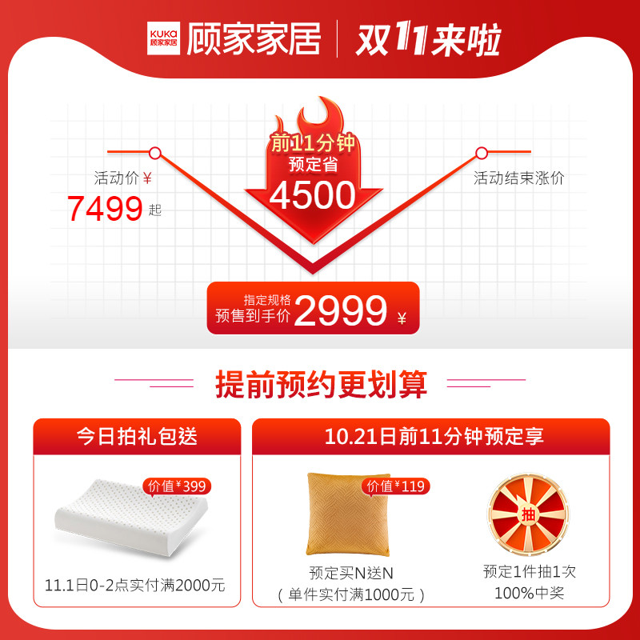 天猫精选在售,下单立减1000元,领取2300元优惠券,叠加1200元家居建材购物券,实付2999元