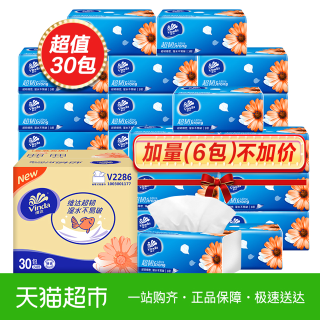 天猫超市64.9元,可领15元优惠券,实付49.9元到手,第二件立减20元,爆款加量装 24+6包 总共30包,整箱装,天猫聚划算单件包邮。维达大品牌,超韧厚实吸水力更强,擦手家用纸加倍柔韧,原生木浆,柔软舒适,湿水不易破,健康生活,从维达开始~
