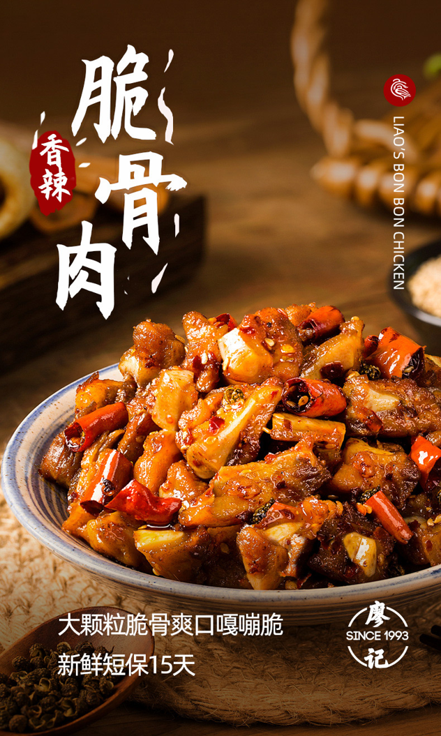 四川拌菜界的扛把子“廖记棒棒鸡”制作,精选猪后腿连接的三叉骨位置,大粒脆骨,脆度适中,颗颗带肉,经过数十道工序,先卤后炒,麻辣鲜香;口感鲜脆肉质Q弹细嫩,韧而不老,嫩而不软,开袋即食,追剧零食,下饭佳品。
