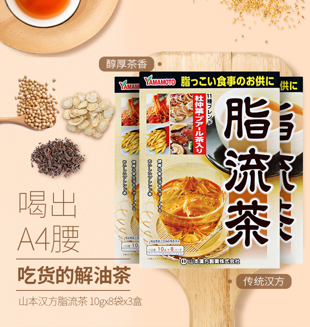 山本汉方脂流茶 ,采用全草本的配方:杜仲茶,波布草,大麦,玄米,乌龙茶,大豆,明日叶,桑叶,武靴叶,绿茶提取物,昆布。含内日本现在流行的减肥配方-发酵杜仲茶精华, 利用配合草本的作用,降低糖分吸收,减少热量堆积,有效降低脂肪在体内的蓄积量。