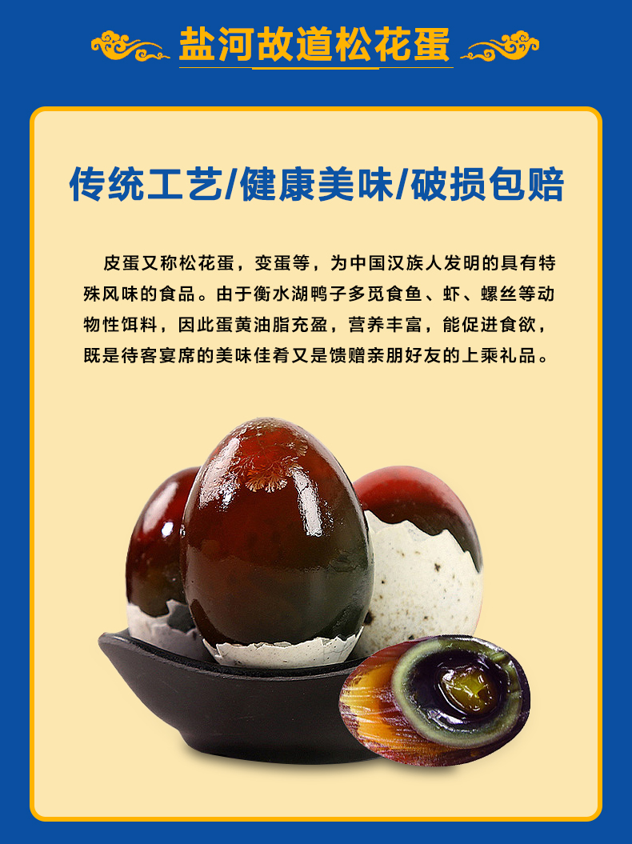 甄选优质鸭蛋健康优质,单枚70-80g。无铅工艺制作,不麻不涩,晶莹剔透,松花明显,口感就因人而异了,反正编辑喜欢,必点的下酒菜。