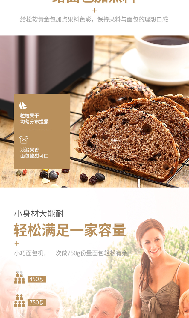 一体成型内盖,方便清洗,不易藏纳污垢,方便清洗;食品级不粘层面包桶,不粘不糊底;10分钟断电记忆功能,10分钟内来电,自动续开,继续停电前的工作步骤,无需重新启动;
