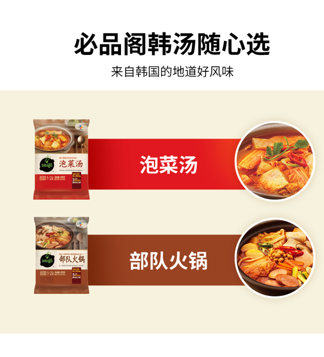 必品阁经典韩式汤底系列,韩国传统工艺熬制,还原韩餐美味,精心调汤,食材随心配,汤酱分离,美味又省心,暖心又暖胃。包含:韩式部队火锅*1+泡菜汤*3