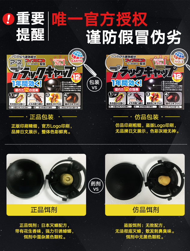“小黑帽”采用五种成分半生熟饵剂,安全无毒无害不含农药。强力引诱一只取食,然后携带病毒回窝传染连窝端,时效长达12个月,小黑屋设计,防止宝宝宠物误食,蟑螂喜暗更爱进,360度全方位引诱,各类蟑螂,全面消灭。