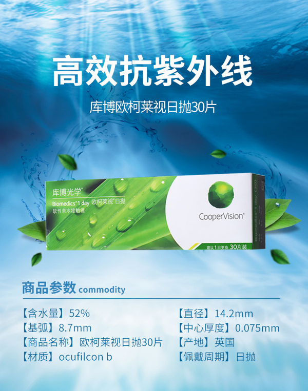 这款隐形眼镜中心厚度只有8.7mm,含水量高达52%,高效缩水,去干涩;添加紫外线吸收剂,能够有效阻挡70%的UVA以及96%的UVB,时刻保护眼睛,更周全。