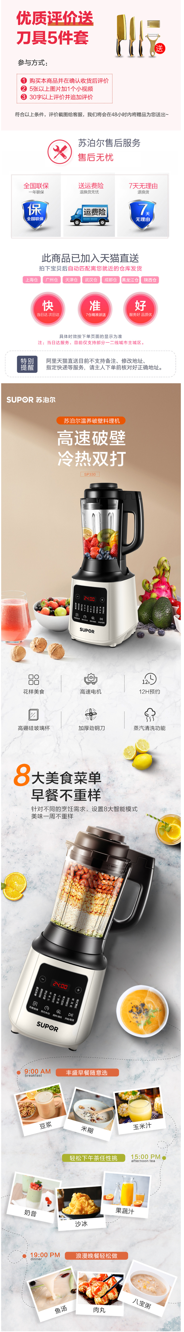 九阳的这款破壁料理机,集合了集料理机、豆浆机、咖啡机、绞肉机、辅食机、研磨机、沙冰机、果汁机等产品功能,可用来做豆浆、米糊、五谷汁、玉米汁、果蔬汁、沙冰,甚至能将整条鱼、排骨等,直接打成细腻骨汤,完全达到一机多用功能。