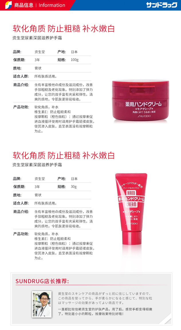 这款是日本排名第一的护手霜,国内也叫它“小红罐”,含有丰富维他命成份及滋润成份,改善手部粗糙及老化现象。特别添加了超级弹力成分,让您的双手富有光采和弹性。清爽的质地,令肌肤更容易吸收。添加多一点滋润、柔软的新尿素成份,加强肌肤表层血液循环,防止皮肤干裂粗糙,给你的双手最好的呵护。